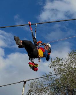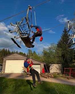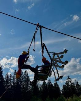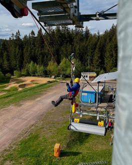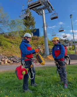Am 8. Mai 2025 trainierten fünf Einsatzkräfte der Bergwacht Oberhof die Evakuierung von Personen aus dem Sessellift im Bikepark Oberhof.