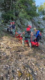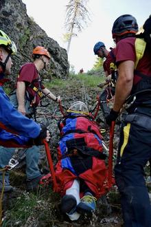 „Menschenrettung in unwegsamen Gelände“ hieß das Einsatzstichwort der Rettungsleitstelle. Zwei Kletterer waren am Neuen Stein im Haseltal bei Oberschönau schwer verunglückt. Ein Kletterer war beim Versuch abzuseilen gestürzt und hatte sich ein Polytrauma zugezogen. Die zweite Person wollte Hilfe holen und war in einem Geröllfeld gestürzt und hat sich dabei eine offene Fraktur am Unterarm zugezogen. Die Rettung brachte die Einsatzkräfte ganz schön ins Schwitzen, da die Ausrüstung nur zu Fuß transportiert werden konnte. Nach der Erstversorgung wurden beide auf der Gebirgstrage abtransportiert.