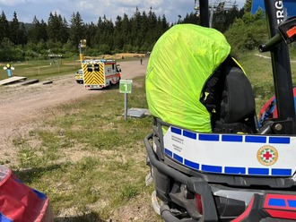 Zusätzlich waren vom 17.-18.06. täglich 7 Einsatzkräfte beim Rookies Downhill Cup im Bikepark vor Ort. Zusammen mit dem Rettungsdienst und einem Notarzt wurden 28 SportlerInnen versorgt. Vier von ihnen waren so schwer gestürzt, dass sie von uns von der Strecke abtransportiert werden mussten, um danach im Krankenhaus weiterbehandelt zu werden.