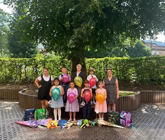 Die Turnhalle war festlich geschmückt, Luftballons und bunte Girlanden sorgten für eine fröhliche Atmosphäre. Schulleiterin Frau von Fintel begrüßte die aufgeregten Erstklässler mit herzlichen Worten und wünschte ihnen einen guten Start in ihre Schulzeit. Sie betonte die Wichtigkeit von Neugierde und Freude am Lernen und versicherte den Eltern, dass ihre Kinder in guten Händen seien. Es führten die älteren Schüler ein kleines Programm auf. Es gab Lieder, Gedichte und Akkordeonstücke.
