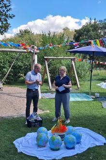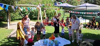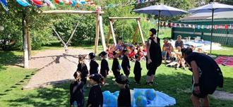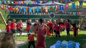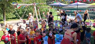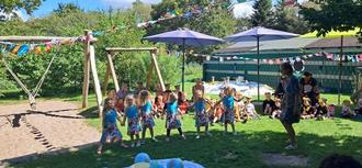 Am 16. August feierten wir dieses Jahr bei schönstem Sonnenschein unser Sommerfest. Dabei gingen unsere Spatzen auf eine Reise um die Welt. Unsere Allerkleinsten machten sich auf den Weg nach Amerika und führten uns einen Indianertanz vor. Dann tauschten unsere Waldstrolche mal ihren Namen und zeigten sich als Pinguine auf ihrem Gang durch die Antarktis. Im Anschluss führten uns die Waldfüchse vor, welche Tiere man alles in Afrika bewundern kann. Und zu guter Letzt gingen unsere Waldhasen auf die Reise nach Asien und besuchten China, zeigten einen landestypischen Tanz und Kampfsport. Speziell auf unserer Reise nach China hatten wir große Unterstützung einer Mama aus der Gruppe, die uns mit Originalmusik und -tanz unterstützte. Mit großem Applaus beendeten wir unsere Aufführung mit dem Lied „Wir sind Kinder einer Welt“.