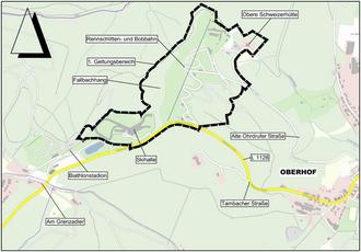 Das Plangebiet (1. Geltungsbereich) liegt etwa 1 km westlich der Ortslage von Oberhof, an der Landesstraße 1128 (Tambacher Straße), welche von Oberhof Richtung Steinbach-Hallenberg führt. Der 1. Geltungsbereich wird im Wesentlichen im Norden von Wald, im Osten von der „Alten Ohrdrufer Straße“ sowie von Wald, im Süden von der „Tambacher Straße“ (L 1128) sowie von Wald und im Westen überwiegend von Wald sowie untergeordnet von der Lotto Thüringen Arena am Rennsteig (Biathlonstadion) begrenzt. Im 1. Geltungsbereich befinden sich die Lotto Thüringen Eisarena Oberhof (Rennschlitten- und Bobbahn), der Lotto Thüringen Bikepark Oberhof bzw. der Lotto Thüringen Snowpark Oberhof (Fallbachhang), die Lotto Thüringen Skisport-Halle Oberhof (Skihalle) und die Obere Schweizerhütte (Pension & Restaurant).