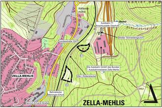 Die Lage der Ersatzmaßnahme E1 und E2 des Bebauungsplans Sondergebiet „Rennschlitten- und Bobbahn/Fallbachhang“ ist dem 8. Übersichtslageplan zu entnehmen. Die Ersatzmaßnahmen E1 und E2 befinden sich südwestlich der Autobahnmeisterei Zella-Mehlis der Autobahn GmbH des Bundes (Straße „Schneidersgrund“) unmittelbar an der Bahnstrecke „Meiningen-Erfurt“ bzw. der (Ski-) Roller-strecke“ des SC Motor Zella-Mehlis im Nordosten der Kernstadt von Zella-Mehlis (Gemarkung Zella-Mehlis). Die Ersatzmaßnahme E1 hat die Entbuschung eines alten Steinbruches westlich der Bundesautobahn A 71 und die Ersatzmaßnahme E2 hat die Entbuschung einer Bergwiese am Erbachsteich zum Ziel.