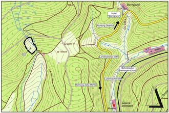 Die Lage der Ersatzmaßnahme E3 des Bebauungsplans Sondergebiet „Rennschlitten- und Bobbahn/Fallbachhang“ ist dem 9. Übersichtslageplan zu entnehmen. Die Ersatzmaßnahme E3 befindet sich nördlich der Ortslage von Zella-Mehlis (Kernstadt) und direkt westlich der „Dammwiese“ (Gemarkung Zella-Mehlis). Die Ersatzmaßnahme E3 hat die Entbuschung einer Bergwiesenfläche „Obere Lämmerfleckswiese“ sowie die Profilierung eines vorhandenen Grabens zur Herstellung seiner ursprünglichen Entwässerungsfunktion zum Ziel. Zudem ist ein innerhalb der Wiesenfläche befindlicher Graben an den östlichen Rand zu verlegen und zu profilieren.