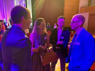 Der Erste Beigeordnete des Bürgermeisters von Zella-Mehlis, Thomas Bischof, und Oberhofs Bürgermeister Daniel Fischer im Gespräch mit Sabine Weiß, Geschäftsführerin der SZM Spannwerkzeuge GmbH Zella-Mehlis, und Sebastian Renner, Prokurist des Hotels Waldmühle in Zella-Mehlis. (v.l.n.r.: Thomas Bischof, Sabine Weiß, Sebastian Renner, Daniel Fischer)
