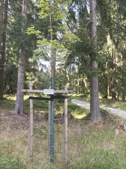 Er steht kurz vor dem Forsthaus Sattelbach, dort, wo sich der Fahr-und der Fußweg von der Straße hinunter treffen, und ist somit von unseren älteren Chormitgliedern per PKW bzw. von denen, die gut zu Fuß sind, per Wanderung zu erreichen.