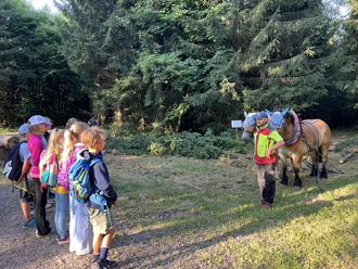 Ein besonderes Erlebnis war das Pflanzen eines Baumes - ein Beitrag für die Zukunft des Waldes. Außerdem durften die Schülerinnen und Schüler verschiedene Forstgeräte kennenlernen. Faszinierend war auch das Rücken von Holz mit Pferden, bei dem die Kinder staunten, wie kräftig und geschickt die Tiere schwere Stämme bewegen können.