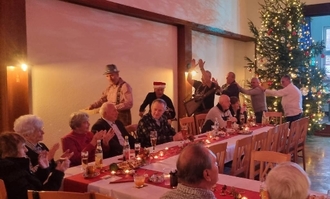 Nachdem sich die Gäste gestärkt hatten, traten die „Deesbacher Schluchtenjodler“ auf. Dafür brauchte man viele Nerven und eine gute Kondition. Thomas Böhm, William Lindner und Andreas Müller sorgten mit altertümlichen Musikinstrumenten aus Tirol für mächtig Stimmung und begeisterten die Seniorinnen und Senioren so sehr, dass sie sich alle zu einer Polonaise durch die Räume hinreißen ließen.
