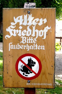 Aus gegebenen Anlass weisen wir noch einmal darauf hin, dass Hunde und ihre Hinterlassenschaften nichts auf dem Friedhof verloren haben. Es ist ein unzumutbarer Zustand, wenn den Gemeindearbeitern beim Mähen der Hundekot um die Ohren fliegt, nur weil die Besitzer zu unachtsam oder zu faul sind, diesen wegzuräumen.