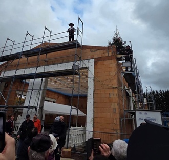 Der Richtbaum wurde durch Herrn Max Weltrich angebracht. Nach den einleitenden Worten des Bürgermeister und der Grußworte der Gäste wurde traditionell der Richtspruch von Herrn Max Weltrich, vorgetragen und ein Glas Sekt auf das Wohl des Bauherrn getrunken und zu Boden geworfen. Das Glas zersprang, was als gutes Omen gilt.