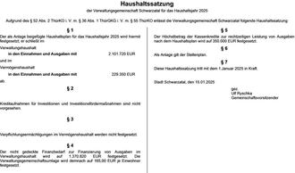 Der Haushaltsplan mit seinen Anlagen liegt in der Zeit vom 07.02.2025 bis 21.02.2025 zu den üblichen Dienststunden der Verwaltungsgemeinschaft „Schwarzatal“ in der Dienststelle Sitzendorf, Hauptstr. 34, 07429 Sitzendorf, Zimmer 208 und in der Dienststelle Stadt Schwarzatal OT Oberweißbach, Markt 5, 98744 Schwarzatal, Zimmer 8a zur Einsichtnahme aus.