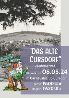 Die nächste, vom Cursdorfer Heimatverein initiierte Veranstaltung steht bereits ins Haus. Unter dem Titel „Das alte Cursdorf“ lädt der Heimatverein zu einem kurzweiligen interessanten Diavortrag am 08.05.24 ab 19:00 Uhr in den Carnevalsclub Bahnhofstraße Cursdorf ein. Vortragende und Kenner der Historie von Cursdorf sind Frank Eilhauer und Arno Schmidt.