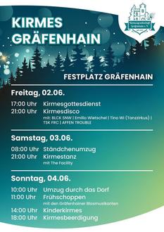 Somit lädt Sie die Kirmesgesellschaft Gräfenhain e.V. herzlichst zum Kirmeswochenende vom 02.-04.06.2023 ein!