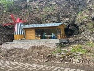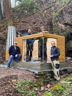 Den Gedanken etwas Neues zu gestalten hatte die Gemeinde und der Heimatverein gefasst. Hierzu hatten wir uns im April 2024 in der Firma H&S Robots bei Herrn Ben Schäfer mit Herr Steffen Rauch, Andreas Jung, Thomas Hofmann und Manfred Mette getroffen und Gedanken entwickelt wie wir dieses Projekt umsetzen können. Herr Schäfer hat hierzu dann die konstruktive Vorarbeit geleistet. Die Mechanik hat Herr Schäfer in seinem Betrieb gefertigt. Danach wurde das Gestell zur Tischlerei Steffen Rauch transportier, hier wurde die Einhausung gefertigt. Herr Andreas Jung war für die Dacheindeckung verantwortlich. Das Wasserrad und Windrad wurden im Bauhof aufgearbeitet. Um unser Sägewerk aufstellen zu können wurde im Vorfeld das Gelände am Wasserfall profiliert und ein Sockelfundament errichtet. Zum Umwelttag war es soweit, unser kleines Sägewerk konnte mit Hilfe der Firma Holzhof M. Sichardt und Herrn F. Schimke an seinen Bestimmungsort gesetzt werden. Somit konnten die Kollegen mit der Montage beginnen.