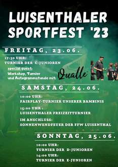 Wir möchten alle Luisenthaler und anderen Gäste recht herzlich zu unserem Sportfest einladen. Es steht dieses mal unsere Nachwuchsabteilung im Mittelpunkt, die sich in unterschiedlichen Turnieren präsentiert. Hier ist am Freitag im Rahmen des C-Junioren Turniers der bekannte Schiri-Influencer `Qualle` zu Gast. Zudem gibt es am Samstag ein Freizeitturnier, wo der Spaß im Vordergrund stehen soll. Unter anderem ist auch eine Frauenmannschaft am Start. Nach dem Turnier gibt es eine Abendveranstaltung mit Musik und guter Laune. Für Speiß und Trank ist bestens gesorgt! Der Eintritt ist selbstverständlich an allen Tagen frei.