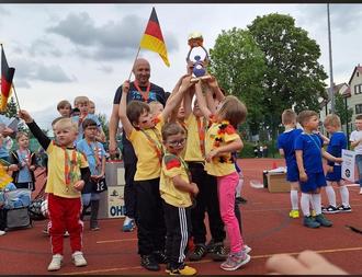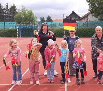 Ausfallen war keine Option, denn die kleinen Ballkünstler wären sonst super enttäuscht gewesen. Dann große Freude, das Wetter soll halten, alle Kinder können antreten. Am Morgen des 31.05.2024 wurden die letzten selbst kreierten Trikots fertig gestellt, mit Fußballmusik alle eingestimmt und voller Aufregung auf den Mannschaftsbus der Thüringeti gewartet. Vielen Dank für das Engagement und die Unterstützung an Herrn Bley. Schnell noch die Wölfiser Mannschaft eingesammelt und dann kamen alle im Goldbergstadion an. Wie im vergangenen Jahr trat Crawinkel als die deutsche Nationalmannschaft mit ihrem Trainer Micha an.
