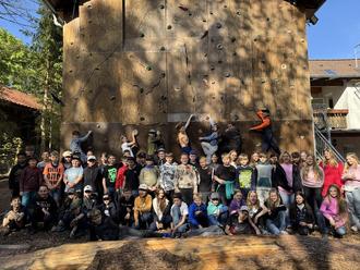 Nachdem wir mit kleinen Fahrgemeinschaften angereist waren, wurden wir herzlich empfangen. Dann wurde uns das Gelände gezeigt und wir spielten zusammen ein Teamspiel. Danach durften wir unsere Zimmer erkunden und alles einräumen, was in unseren Koffern war. Viele hatten großen Hunger, deshalb haben wir dann Mittag gegessen. Nach dem Essen wurden wir an der Kletterwand erwartet. Bevor wir klettern durften, beschloss jede Klasse einen Fairnessvertrag mit Verhaltensregeln und uns wurde erklärt, wie man beim Klettern sichert. Danach durften wir an der Kletterwand unseren Mut beweisen. Das hat Spaß gemacht. Später hatten wir Freizeit, die wir zum Spielen auf dem Gelände nutzten.
