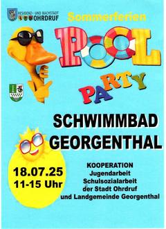 Am Freitag, den 18.07.2025, wird das Schwimmbad in Georgenthal zur Bühne für die große „Sommerferien-Pool-Party“ der ländlichen Jugendarbeit. Von 11:00 bis 15:00 Uhr laden die Jugendsozialarbeiter der Stadt Ohrdruf und die Jugendsozialarbeiter der Landgemeinde Georgenthal zu einem bunten Tag voller Wasserspaß, Bewegung und Musik ein.