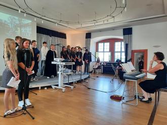 Tatkräftig unterstützt wurden die Musiker und Sänger von ihrer Klassenleiterin Tamara Kuhn, die eine digitale Hintergrund-Präsentation - gewissermaßen als Bühnenbild - konzipierte, vorbereitete und technisch umsetzte. Zum Gelingen trug außerdem das hochengagierte Team der Technik-AG des Gymnasiums maßgeblich bei, unterstützt von Franz Kallenbach vom Verein Livehilfe Charity Streaming e. V.