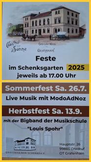 Wir laden Sie am 26.07.2025 ab 17 Uhr zum Sommerfest in den Schenksgarten ein. Die Band "ModoAdNoz" wird uns wieder kräftig einheizen. Für das leibliche Wohl ist gesorgt. Wir freuen uns auf Ihr Kommen.