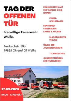 Die Freiwillige Feuerwehr Wölfis lädt alle Gäste aus nah und fern herzlich zum Tag der offenen Tür in und um das Feuerwehrgerätehaus ein. Am Sonntag, 17.09.2023 von 10 Uhr bis 17 Uhr erwartet Sie ein abwechslungsreiches Programm für Groß und Klein. Auch für das leibliche Wohl ist wie immer bestens gesorgt - ab 12 Uhr gibt es Erbsensuppe aus der Gulaschkanone und Bratwurst vom Grill. Bei Kaffee und Kuchen können Sie am Nachmittag dem Wölfiser Blasorchester lauschen.