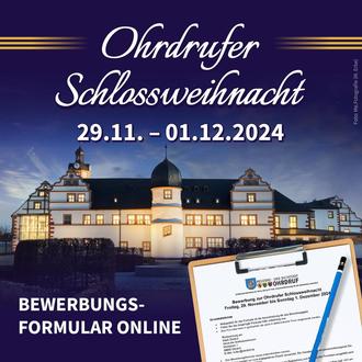 Ab sofort können sich Händler und Versorger für die Teilnahme an der Ohrdrufer Schlossweihnacht bewerben. Das Formular steht online zur Verfügung. Die Bewerbungsfrist endet am 30.09.2024.