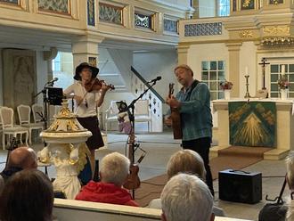 begleitete Udo Hemmann sie zeitweise ganz stimmungsvoll auch mit der Mandoline. Zu dem französisch und deutsch gesungenen französischen Tanzlied „Pour passer le Rhône“ packte Udo Hemmann auch die Ukulele als Begleitinstrument aus. Irische Musik, die aus der Erfahrung beider Musiker die Menschen besonders berührt, war mit dem Instrumentalstück „Drowsy Maggie“, zu dem auch die Rahmentrommel effektvoll erklang, zu hören. Mit „Time's A Wastin' “, dem bekanntesten Duett von June Carter und Carl Smith Anfang der 1950er besungen, interpretierten die beiden das Thema, wie die Zeit vergeht. Bunt und abwechslungsreich war das Programm - mit „The Wellerman“ folgte ein altes Seemannslied der Walfänger, das einen jungen schottischen Briefträger vor etwa zwei Jahren zum Shanty-Star werden ließ. Das zu Herzen gehende Liebeslied „If I Needed You“ brachte einen lyrischen Beitrag ins Konzert. Und aus dem Film „PS, ich liebe dich“ erklang im Anschluss „Galway Girl“, in dem Constanze Ulrich auch die Tin Wistle, die typisch irische Blechflöte erklingen ließ. Mit dem Song „Kopfhaut“ von den Ärzten, einem Lied über die Reiseerinnerungen in das Land der nordamerikanischen Ureinwohner, begründete Udo Hemmann den Konzertgästen, weshalb beide stets mit Hut in ihren Konzerten auftreten. Einmal musikalisch auf dem Doppelkontinent der westlichen Hemisphäre unterwegs, folgte mit “Tico-Tico no Fubá” ein mitreißendes Stück der klassischen lateinamerikanischen Unterhaltungsmusik. Aus der Zusammenarbeit in verschiedenen Projekten von Udo Hemmann mit der in Berlin lebenden Schauspielerin Sanam Afrashteh entstand deren beider Song „Du fehlst so“, ein sehr emotionales Stück. Für Trübsal und Gram ist im Leben kein Platz..., das ist die Botschaft des alten französischen Volksliedes „Ami, dans cette vie“ mit sehr melodischen Violinen- und teils kräftigen Gitarrenklängen. Als zum Finale Udo Hemmann zur „Locomotive Breath“- Melodie von Jethro Tull das Volkslied „Am Brunnen vor dem Tore“ intonierte, ging das Publikum voll mit.
