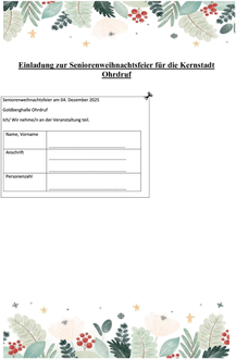 Im Waldbote Ausgabe 23 und 24 ist ein Anmeldeabschnitt zu finden. Dieser kann zur reibungslosen Anmeldung genutzt werden. Hierfür einfach den Abschnitt ausfüllen und ausschneiden und bis zum 28.11.2025 in der Stadtverwaltung Ohrdruf abgeben.