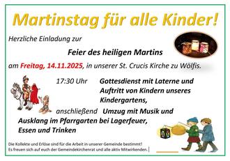 | 17:30 Uhr | Gottesdienst zum Martinstag für Groß und Klein, Umzug mit Laternen und Ausklang im Pfarrgarten |