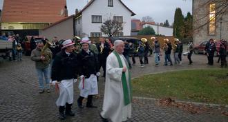 or der Kirche warteten schon die Musiker der „Kapelle ohne Namen“ und die Kameraden der Freiwilligen Feuerwehr und der Kinder- und Jugendfeuerwehr Wölfis, um den Umzug zu begleiten und abzusichern.