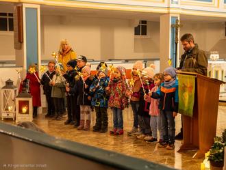 Ganz bewusst machten die Kinder des Wölfiser Kindergarten mit Liedern und gespielten Gedichten die Botschaft vom Heiligen Martin deutlich. Man merkte sehr wohl den Eifer, mit dem sie es eingeübt hatten. Ganz traditionell gab es am Ausgang dann die vom Kindergarten gebackenen Hörnchen zum Teilen.
