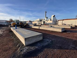 Solarcarport-Fundamente im Vordergrund und das rundum sanierte Heizhaus im Hintergrund.