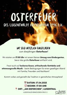 In diesem Jahr lädt der Luisenthaler Kirmesverein zum traditionellen Osterfeuer ein. Die Veranstaltung findet am Donnerstag, den 17. April 2025, auf dem Gelände „Am Kieferchen“ statt.