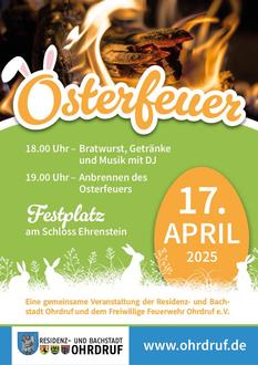 Am Gründonnerstag, den 17. April 2025, lädt die Residenz- und Bachstadt Ohrdruf gemeinsam mit dem Freiwilligen Feuerwehr Ohrdruf e. V. zum traditionellen Osterfeuer ein.