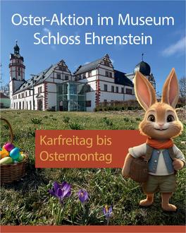 Zu Ostern bietet das Museum Schloss Ehrenstein eine kleine Ostereiersuche quer durch die Ausstellungen an. 12 Eier hat der Osterhase im Museum an bestimmten Exponaten versteckt. Diese Eier gilt es zu sichten. Im Rahmen der Suche können Kinder und Jugendliche spielerisch die Ausstellungen eigenständig zusammen mit ihrer erwachsenen Begleitung erkunden. Wer alle Eier findet, erhält eine kleine Belohnung.