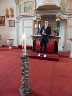 Mit dem Konfirmationsspruch 1. Korinther 13.13 „Nun aber bleiben Glaube, Hoffnung, Liebe, diese drei; aber die Liebe ist die größte unter ihnen“ wurde er im Kreise seiner Eltern und Paten von Pfarrer Lörzer eingesegnet und durfte seine Konfirmationskerze an der Osterkerze entzünden.