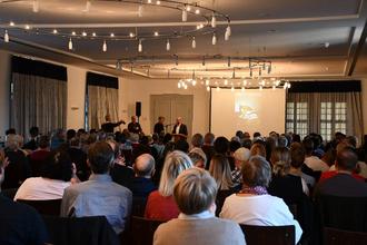 Am Abend präsentierten wir im Bürgersaal von Schloss Ehrenstein den Dokumentarfilm „16 Photographs at Ohrdruf“ von Matthew Nash, der extra aus den USA angereist war. Ein Film, der tief berührte und die Erinnerung an die Geschehnisse von damals eindrucksvoll wachhielt. Im Anschluss der Filmvorführung fand eine angeregte Diskussion mit Nash statt. Als Dankeschön erhielt er einen Sonderpreis, der vom Thüringer Kommunalverlag (THK) in Arnstadt gestiftet wurde.