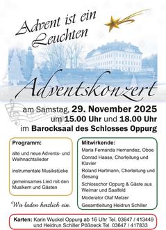 Auch in diesem Jahr lädt der Schlosschor Oppurg wieder herzlich zur adventlichen Einstimmung ins Schloss Oppurg ein. Es gibt 2 Konzerttermine. Wir freuen uns, Sie in dieser aufregenden Zeit mit besinnlichen Klängen am Samstag, 29.11.25 um 15 Uhr sowie um 18 Uhr begrüßen zu können.