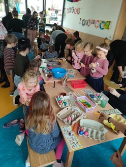 Der Turnraum mit Gästen übervoll, das fanden wir mega-toll. Glitzer, Kleber, Federn, bunte Farben, die den Eiern die Einzigartigkeit gaben. Klein und bunt entstanden am Ende viele tolle Ostereier durch große und kleine Hände.