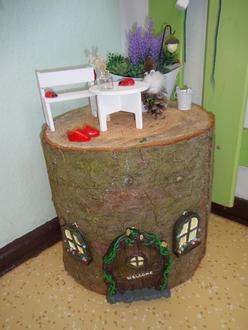 Im Mai standen vor Adwins Wichteltür Zaubersamen (Kresse), eine Schale und Watte mit der Botschaft „Zaubersamen zu säen“.