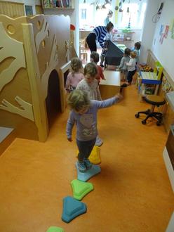 Unsere Kleinsten haben zurzeit sehr viel Freude am Klettern, Balancieren und Kriechen - da wird der Gruppenraum ganz schnell „umgebaut“ und eine Balancier- und Krabbelstraße gebaut.