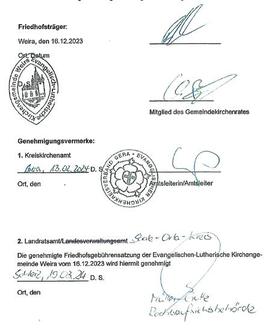 [Nur für Thüringen: Die Rechtsaufsichtsbehörde, die für die Kommunalgemeinde zuständig ist, auf deren Gebiet sich der Friedhof befindet, hat am 19.03.24 die erforderliche Genehmigung erteilt.]