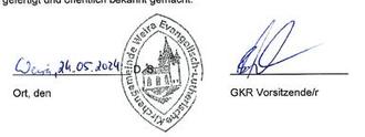 Die vom Gemeindekirchenrat der Kirchengemeinde Weira am 16.12.2023 beschlossene Friedhofsgebührensatzung für den Friedhof in Weira wurde dem Kreiskirchenannt Gera als zuständiger Aufsichtsbehörde angezeigt. Die Aufsichtsbehörde hat am 13.02.24 unter dem Aktenzeichen 16/56 K 330/331 vorstehend genannter Ordnung die kirchenaufsichtliche Genehmigung erteilt.