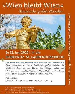 Wir laden Sie ganz herzlich zu unserem ersten Konzert der diesjährigen großen Konzertreihe in der Bodelwitzer Kirche ein. Entspannen Sie bei klassischer Musik und genießen Sie anschließend Kaffee und Kuchen in geselliger Runde!