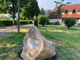 Der schlichte, in die Erde eingelassene Findling mit der Inschrift „Zur Erinnerung an die 900 Jahrfeier in Langenorla 1123 - 2023“ erinnert an die erste urkundliche Erwähnung des Dorfes im Jahr 1123.