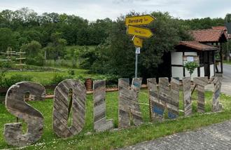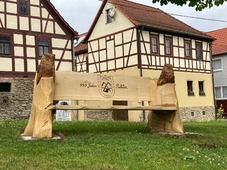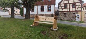Die 950-Jahrfeier-Bank hat auch ihren angemessenen Platz im Dorf erhalten. Direkt oberhalb der Kirche unter Eiche und Kastanie lädt sie zum Verweilen, mit einem wunderschönen Dorfblick, ein.