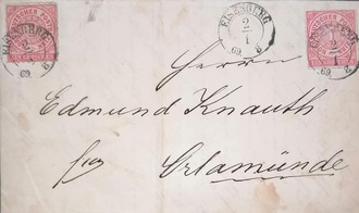 So habe ich hier einen Faltbrief Guidos vom 02.01.1869 aus Eisenberg an seinen Bruder Edmund Knauth, freigemacht mit 2 Groschen für einen Brief mit einem Zollgewicht von höher 1 Loth (>16,666 g).