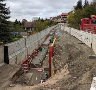 Der Bau der Stützmauer auf der Nordseite der Dienstädter Straße ist fast abgeschlossen. Nach der Verfüllung muss dann noch die Kappe betoniert werden.