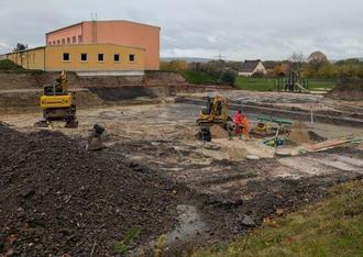 Die Baugrube für den Neubau der Grundschule ist hergestellt. Aufgrund des Baugrundes musste in einem Teil der Baugrube ein Bodenaustausch vorgenommen werden. Die Kläranlage und der Fettabscheider sind gesetzt. Zur Zeit werden die Grundleitungen verlegt.
