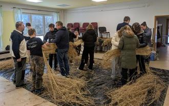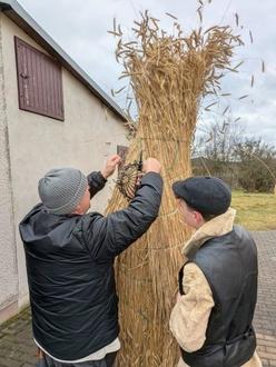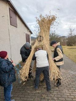 Am 31.01.2026 hatten die Schülerinnen und Schüler der 8. Klassen mit Eltern unter Anleitung von Mario Gäbler die Strohmatten gebunden. Unterstützt wurden sie dabei auch von Annett Gäbler. Das Langstroh wurde dankenswerterweise wieder von der Familie Fickelscher aus Freienorla bereitgestellt. Es muss extra angebaut werden, mit Hand geerntet und gedroschen werden, um dann mäusefrei gelagert zu werden.